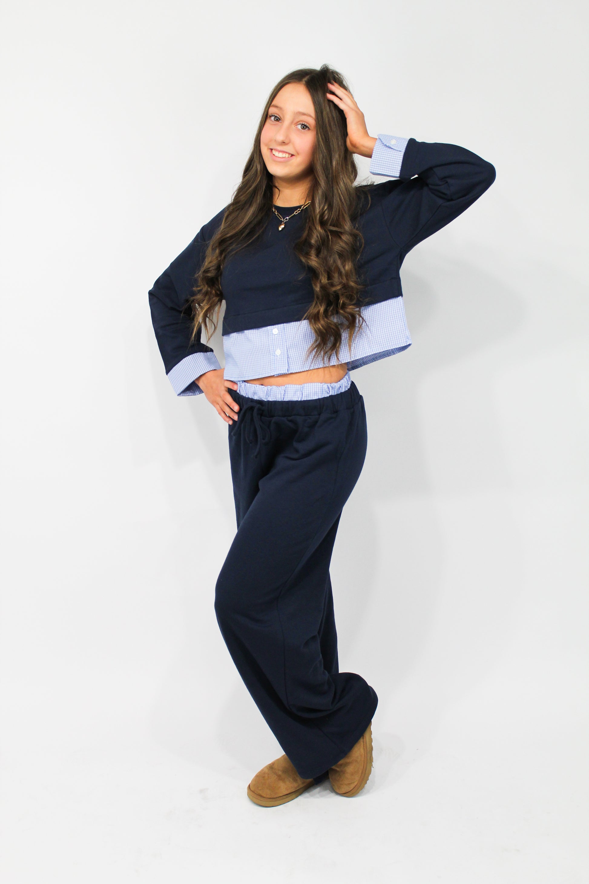 A cozy two-piece set featuring a cropped sweatshirt with contrast blue detailing and matching relaxed-fit bottoms. Comfortable, elevated, and perfect for lounging or casual days out.