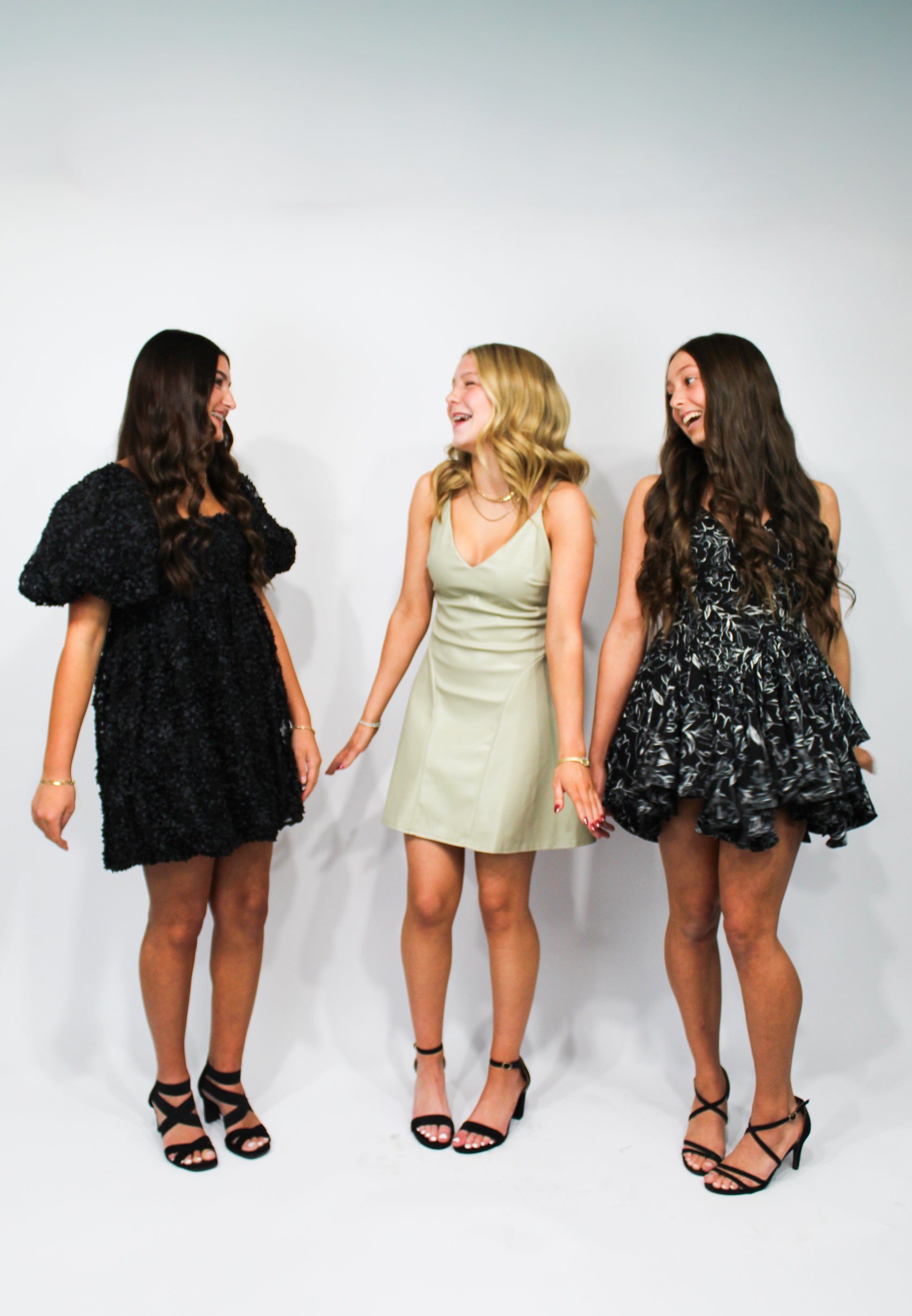 A flirty mini dress with a ruched twist-front bodice, deep V neckline, and a tiered ruffle skirt. The black-and-white floral line print is chic, modern, and eye-catching.