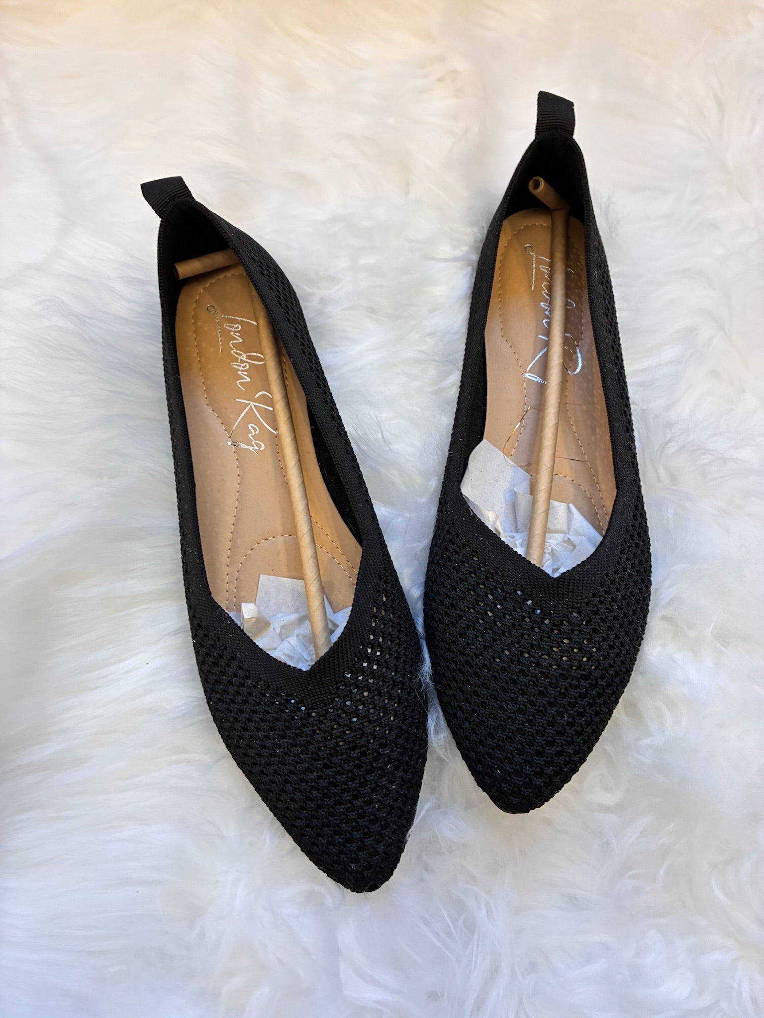 Ultra-lightweight black knit flats with a breathable woven texture and a sleek pointed toe. Flexible, comfy, and ideal for all-day wear.