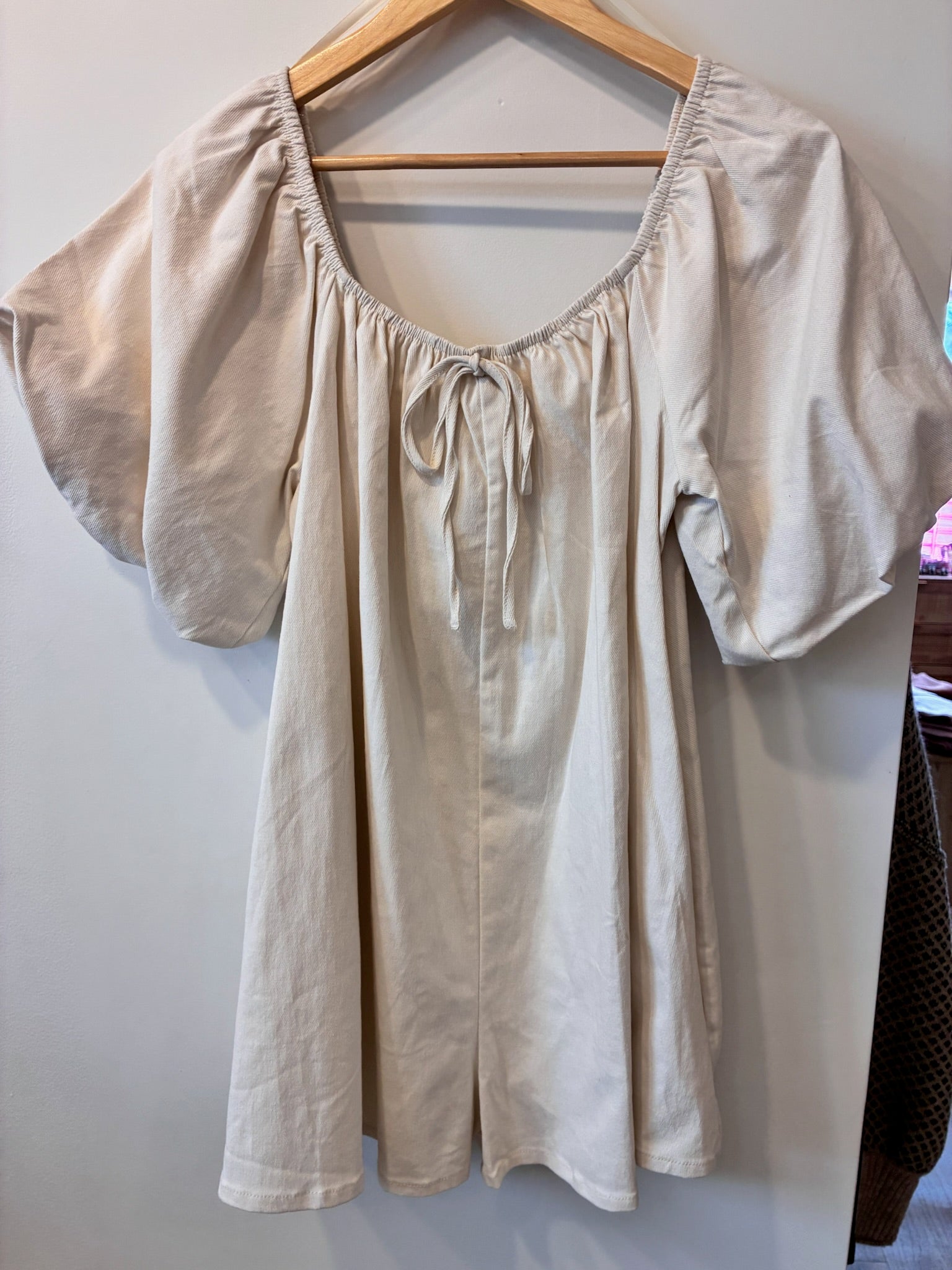 A feminine denim romper in a soft cream wash, designed with a peasant-style gathered neckline, tie-front detail, and fluttery sleeves. Features a relaxed, flowy silhouette with built-in shorts and side pockets for comfort and ease. Effortless, airy, and perfect for everyday boutique styling.